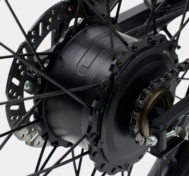 Der 2400-W-Nabenmotor liefert eine Höchstgeschwindigkeit von 60 km/h und 106 Nm Drehmoment.